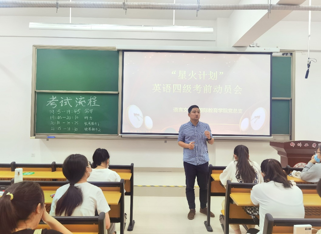 为树立考生信心,鼓励学生积极应对即将到来的英语四级考试,“星火计划”培优班英语四级考试动员会于2022年5月19日晚在北校区T2-403顺利开展。本次动员会面向我校100余名“星火计划”培优班学生,语言文化与国际教育学院党总支副书记邓先超老师做动员讲话。