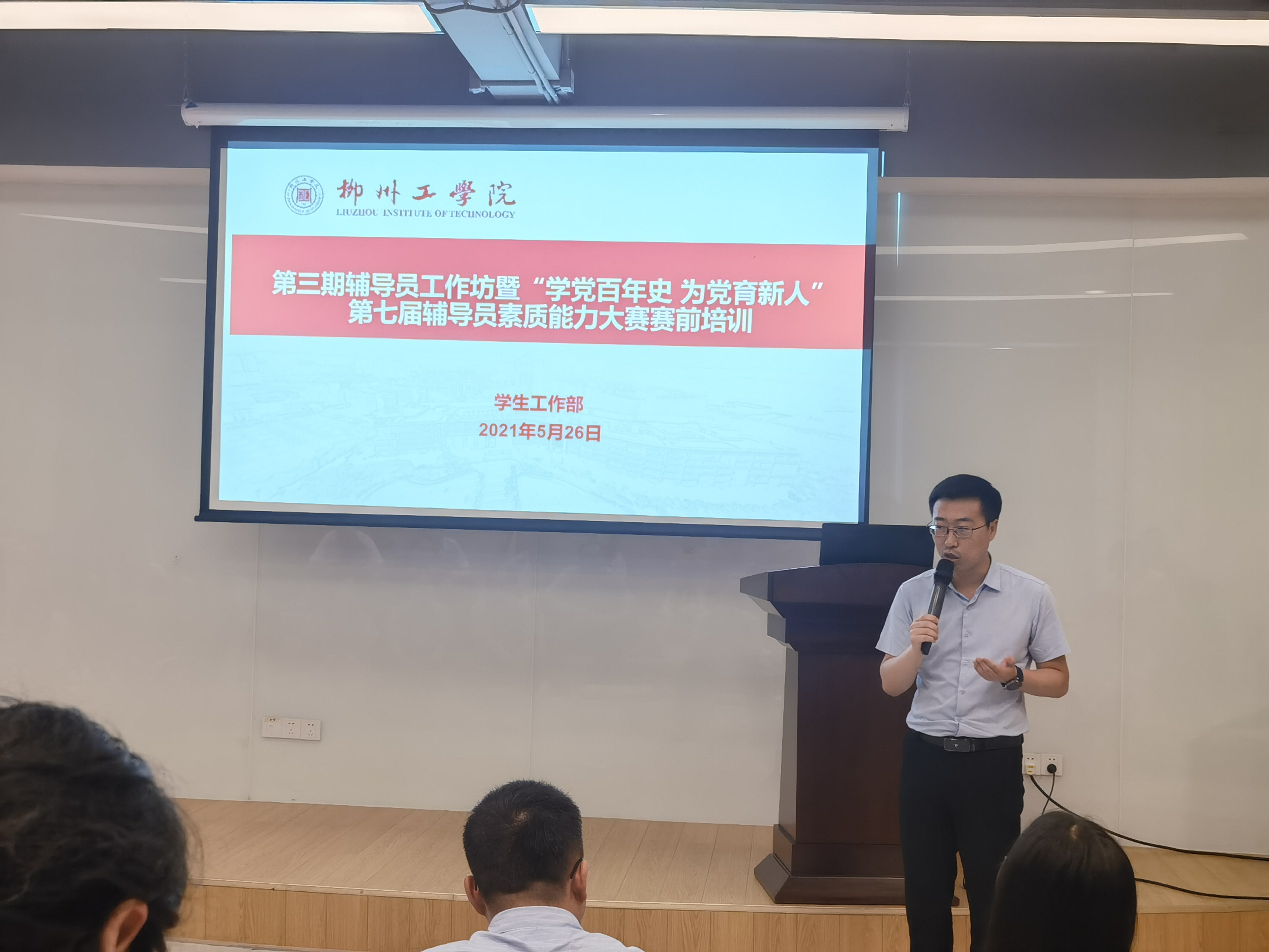 为切实推进辅导员队伍建设,提升辅导员工作能力和业务能力,2021年5月26日下午,由学生工作部举办的柳州工学院第三期辅导员工作坊暨“学党百年史 为党育新人”第七届辅导员素质能力大赛赛前培训在图书馆B区四楼小型报告厅举行。学生工作部邀请了广西卫生职业技术学院团委副书记、医技系辅导员曾旭红老师和柳州职业技术学院覃晓晨老师为主讲人。学生工作部全体人员,各系党总支副书记及全体专职辅导员参加了本次活动。活动由学生工作部思政科科长唐钰婕主持。