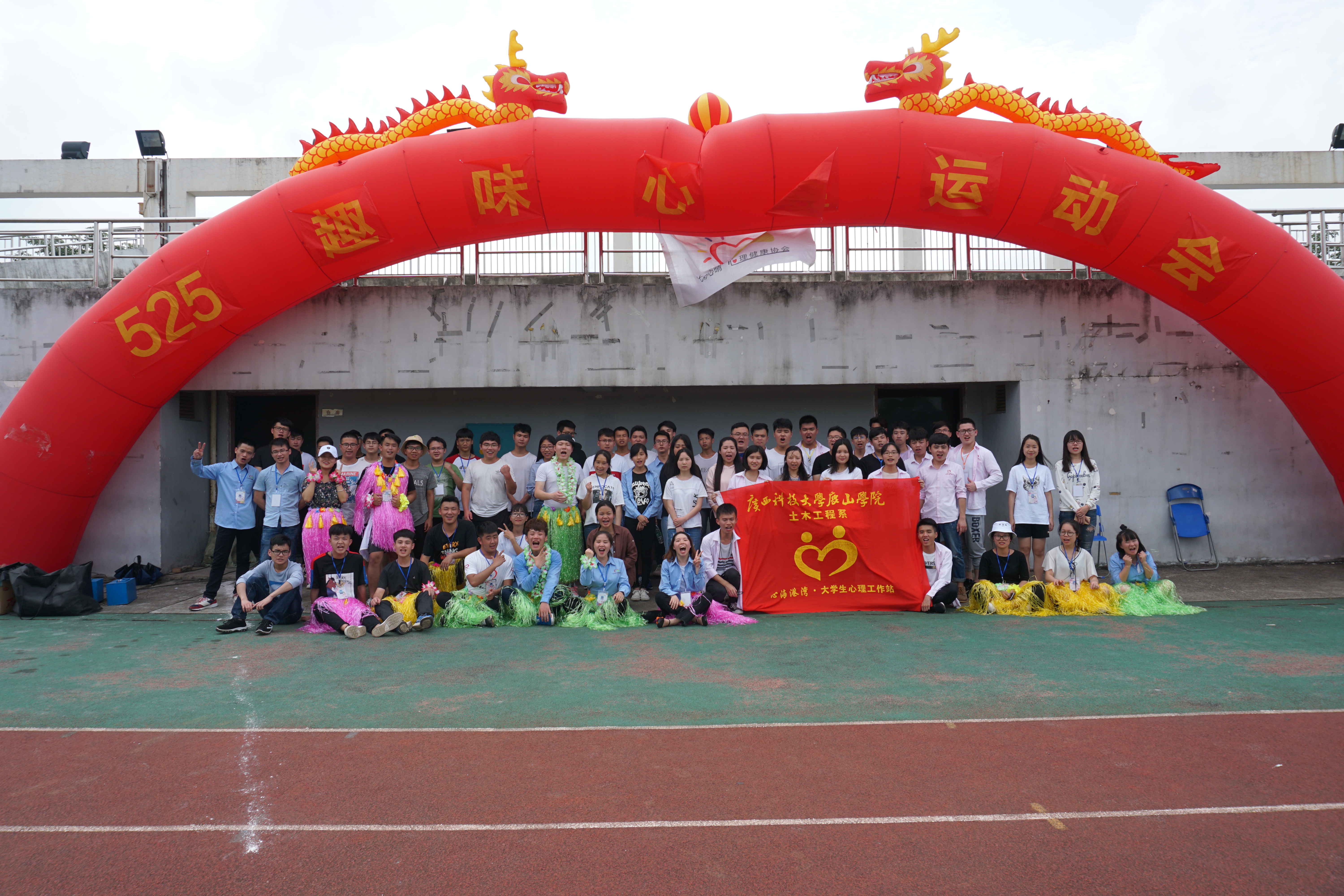 我院在2018年5月5日上午9点,在学院田径场举办了本届525趣味心理运动会。此次趣味心理运动会面向全院学生采用易班线上平台报名。每支队伍6人,共计103支参赛队伍参赛。整个趣味心理运动会包括军旗大战、极速时限、六人五足、穿梭跳绳、珠行万里5个趣味竞技项目和雷池取水1个体验项目。
