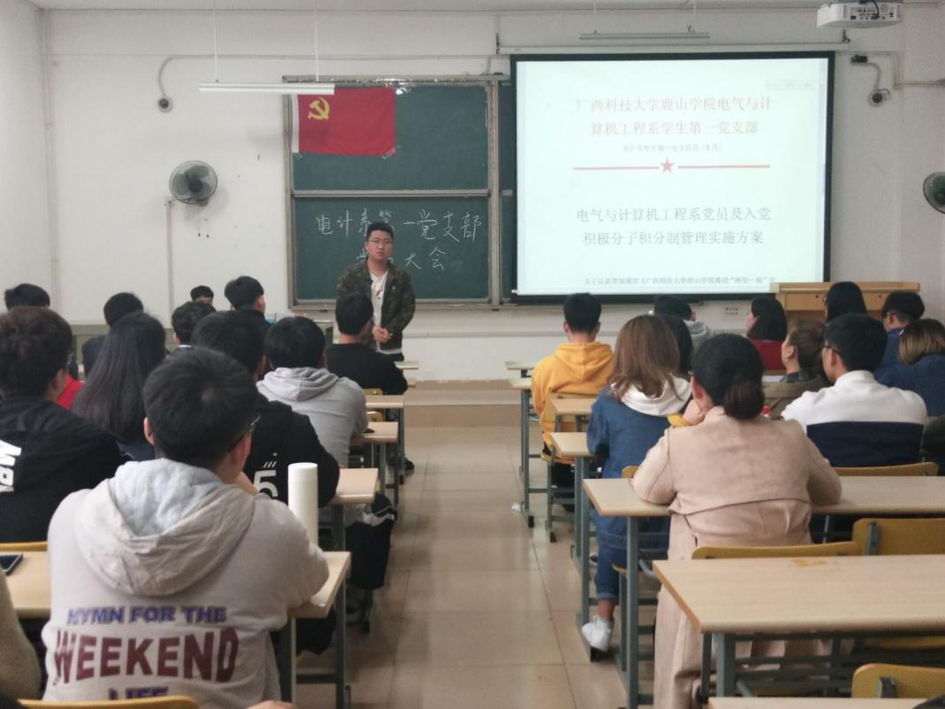 为了认真贯彻落实《广西科技大学鹿山学院推进“两学一做”学习教育常态化制度化的实施意见》文件精神,提升党支部“54321凝聚工程”党员教育管理活动的制度化体系化水平,创新党员教育管理方式,增强党性意识,促进党员先锋模范作用,调动广大党员的积极性,电气与计算机工程系学生第一党支部于3月18日下午15:45在第一实训楼410教室召开关于推行党员和入党积极分子积分制管理的党员大会。