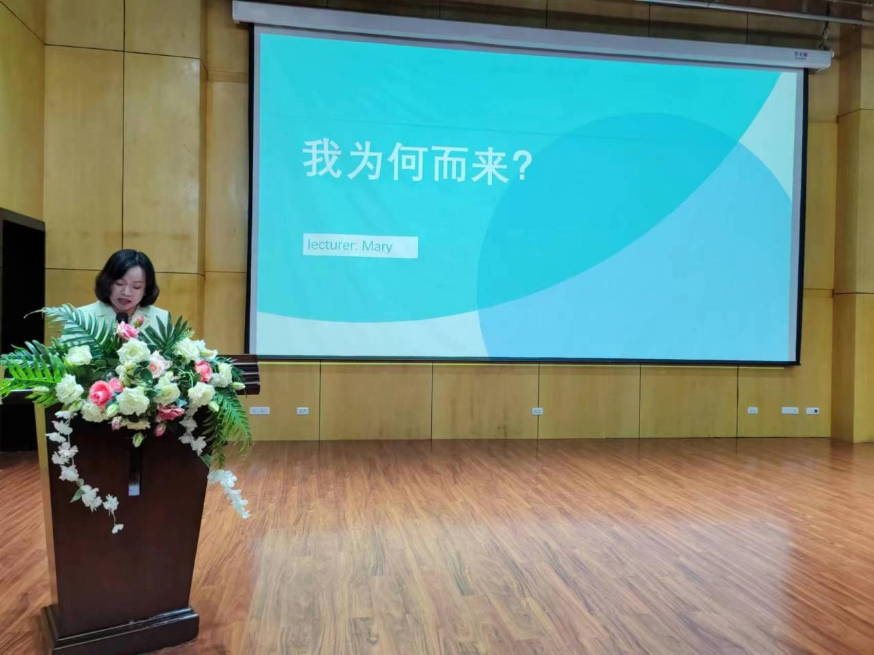 教师代表胡春华在发言中鼓舞同学们既然选择语言类专业,就要有自信与志气,提醒同学们不断自我挑战,在有棱有角中闪闪发光,活出自己想要的样子。