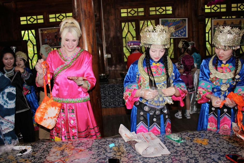 活动当天,教师代表和学生代表早早地来到了现场,穿着节日盛装,共同庆祝这个传统民族节日。本次活动主要分为民俗文化体验活动和民俗文化主题团建活动。民俗文化体验活动中,教师代表和在场学生积极参与各种民俗文化活动,如体验扎染、跳竹竿舞、打油茶等。在制作油茶的环节中,师生们相互协作,参与侗族传统油茶的制作过程。在跳竹竿舞的环节中,师生们跟着音乐的节奏,欢快地跳动着,现场充满了欢声笑语,气氛热烈。在体验扎染的过程中,教师代表和在场学生发挥自己的创意和想象,制作出一件又一件精美独特的方巾和包包。学校外籍教师、社交媒体博主苏菲也参与此次活动,借助网络平台力量宣传柳州本地民族文化,有效助力提升本土文化的知名度。