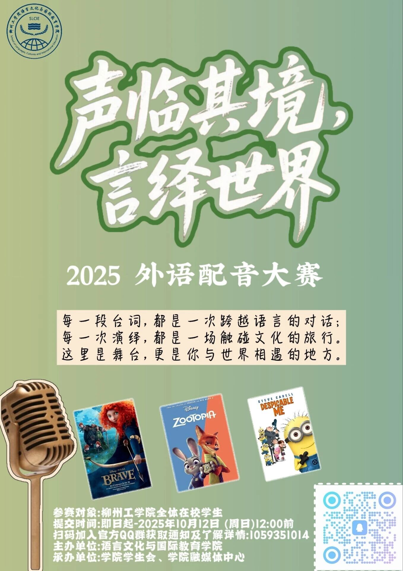 为营造浓厚的外语学习氛围,激发学生学习外语的兴趣与热情,提升学生的外语口语表达能力、跨文化理解力及团队协作精神,语言文化与国际教育学院现正式启动“声临其境,言绎世界”外语配音大赛。我们期待你的声音,成为连接不同文化、打动我们心灵的那座桥梁。