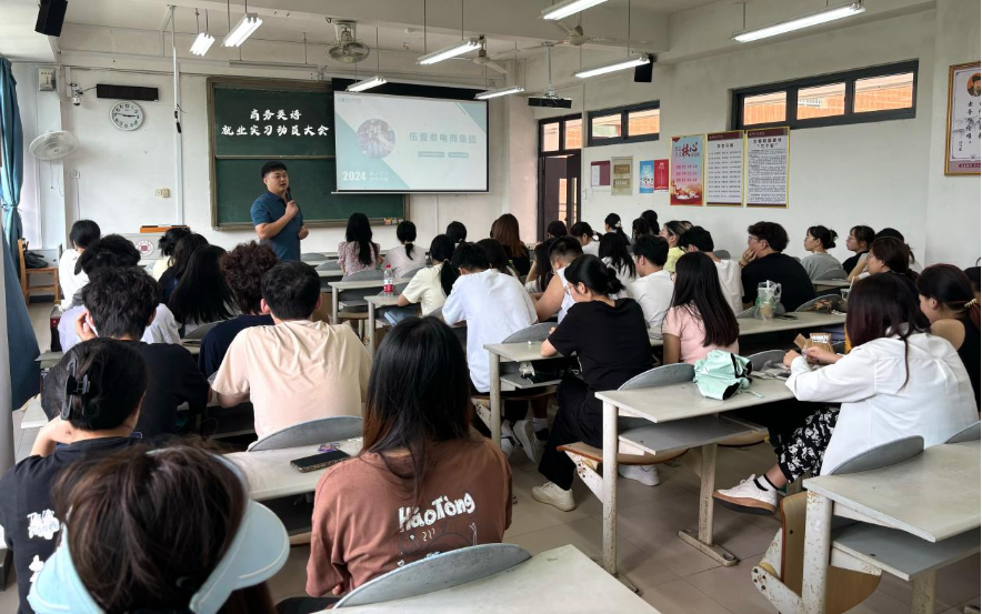 2024年6月7日下午,语教学院21级商务英语专业组织召开实习就业动员大会,并邀请深圳市伍壹叁电商集团有限公司广西区域经理周晓峰进行企业实习宣讲和座谈。商务英语教研室主任宋琳琳、副主任任青玲、专任教师王艳丽、21级全体商英专业学生参与此次动员大会。