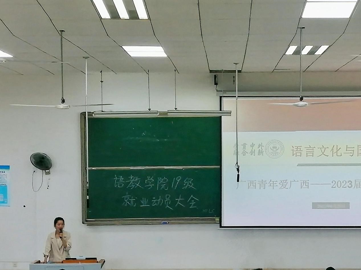 为了鼓励毕业生留桂留柳工作,教育和引导毕业生明晰当前就业形势,清晰职业规划与求职目标,2022年6月26日下午,语言文化与国际教育学院于一教阶2召开“广西青年爱广西”2023届毕业生就业动员大会。语教学院院长黄锦华、党总支书记杨新建、副院长董月琳、副书记邓先超和教研室教师代表以及2023届全体毕业生参加本次大会。会议由团委指导老师黄丽莉主持。
