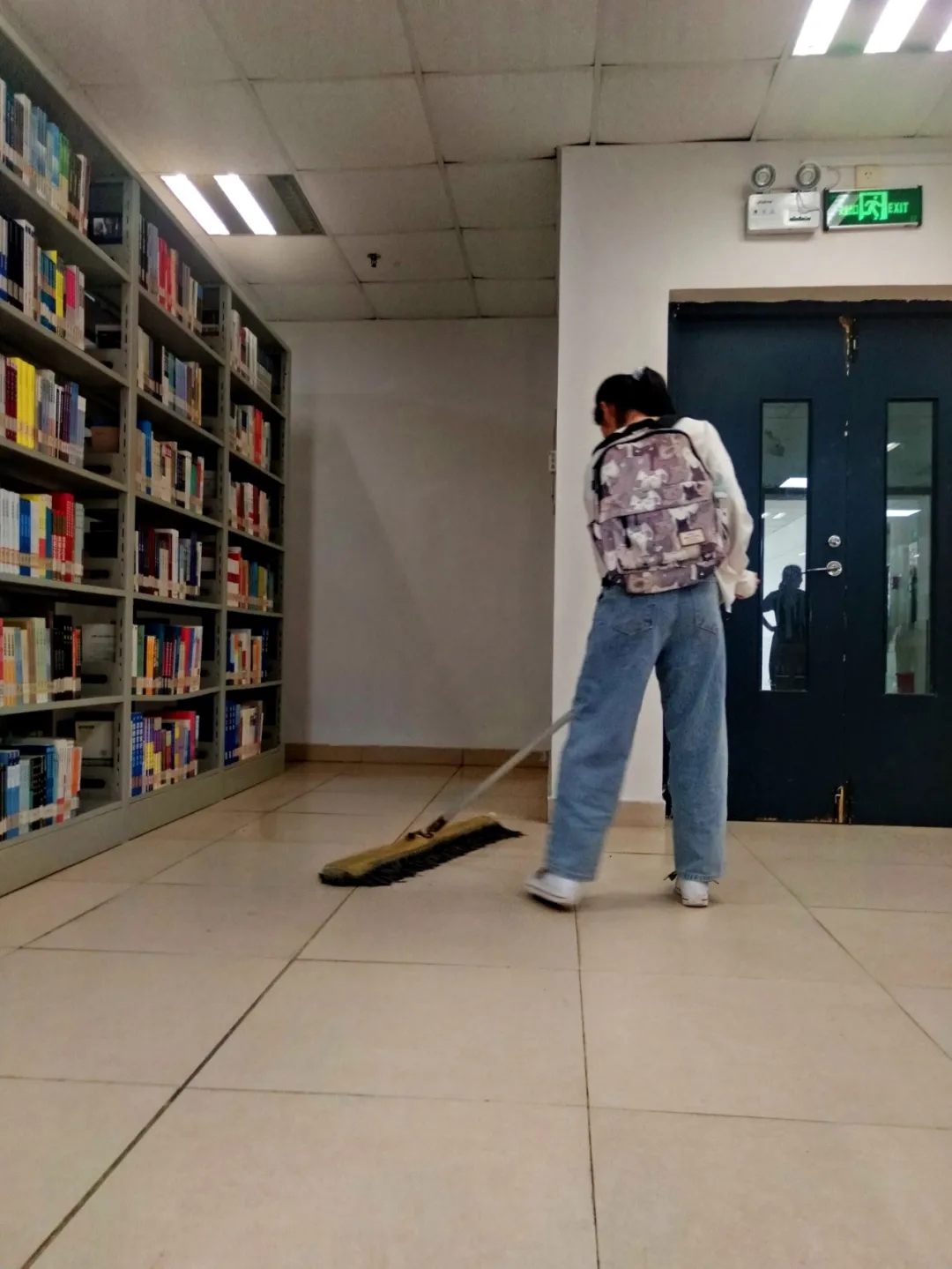 在负责人布置任务后,同学们分配了清扫工具,积极地投入到清洁工作当中,认真的清洁地面,桌子,窗户,书架,同时还不忘照顾正在看书的同学,打扫时大家都轻手轻脚。