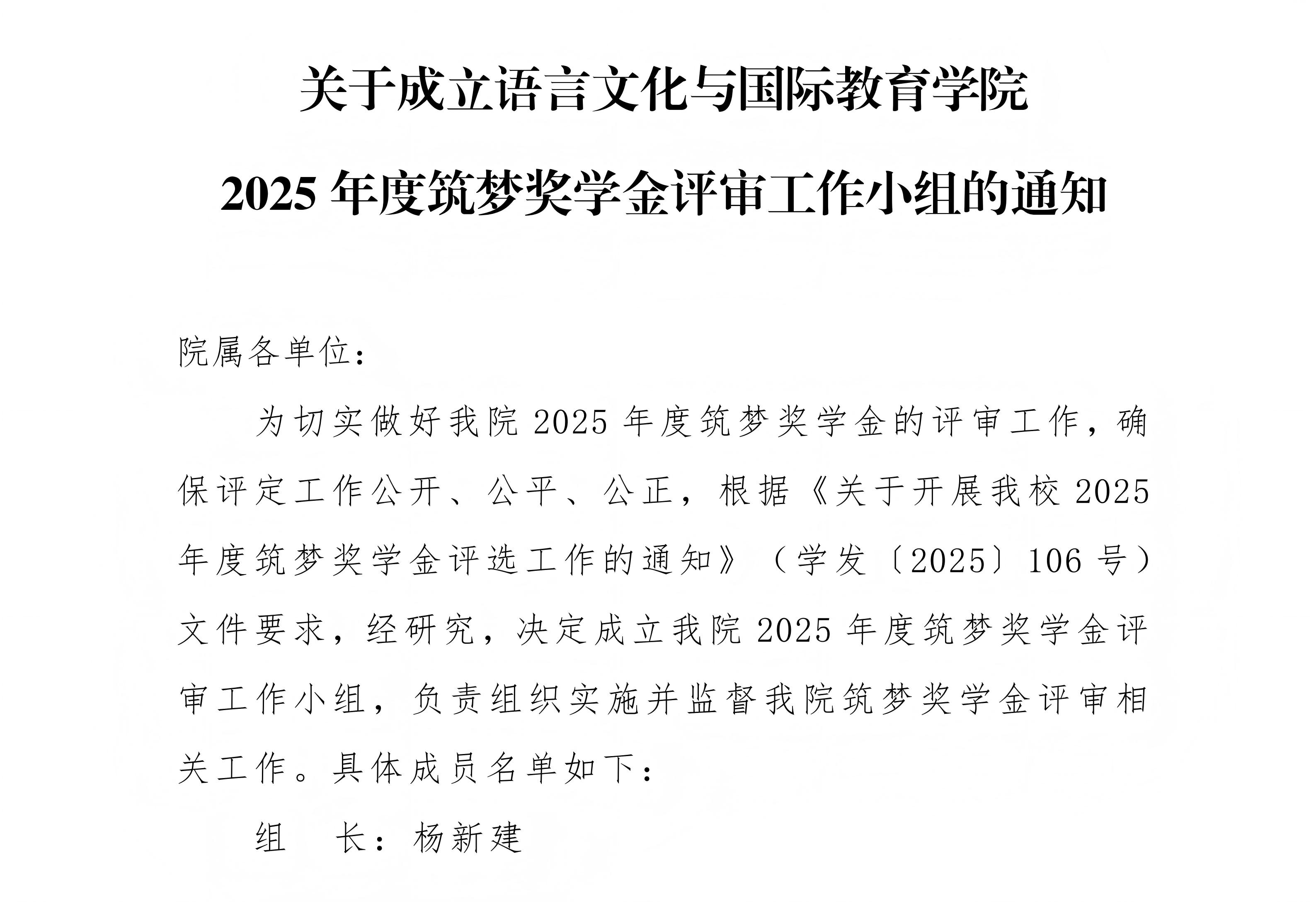 关于成立语言文化与国际教育学院2025年度筑梦奖学金评审工作小组的通知