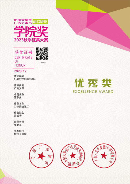 近日,中国大学生广告艺术节学院奖2023秋季赛比赛结果揭晓,我院视觉传达设计专业221班和222班的参赛选手们凭借出色的表现,在众多选手中脱颖而出,在广告文案赛道中斩获佳绩,拿下45个全国奖项。