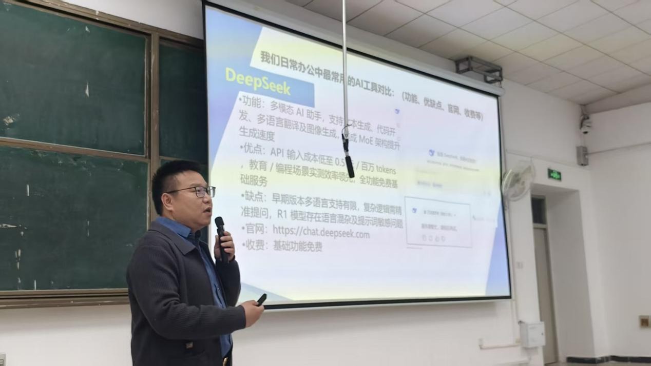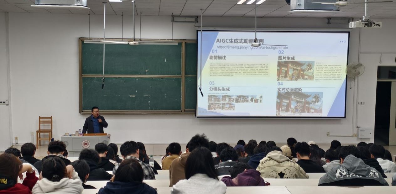 讲座伊始,朱教授系统阐释人工智能与AIGC核心概念,重点解析其通过深度学习生成多元内容的核心能力,并对比DeepSeek、豆包等常用AI工具的功能、优劣及收费情况,为学生提供实用应用参考。核心技术应用环节,他结合全流程开发实战案例,直观展示AIGC与传统动画技术在概念设计、智能贴图等环节的融合场景,让同学们清晰感知AIGC 对动画创作的全流程变革 —— 既提升创作效率,又拓展艺术表达边界,实现水墨动画与粒子特效结合、经典艺术风格动态化等创新效果。