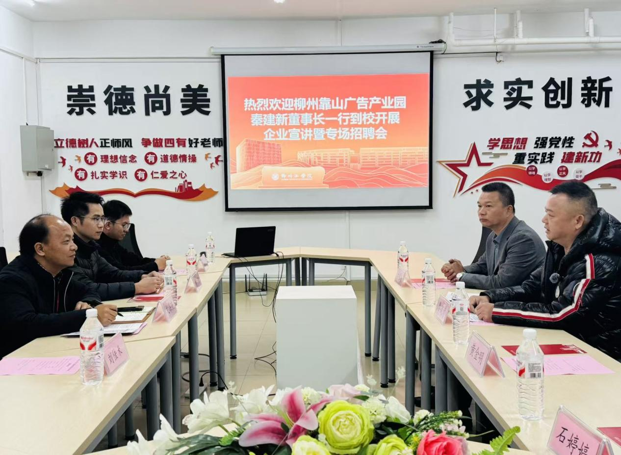 活动伊始,文海燕对柳州靠山广告产业园秦建新董事长一行的到访表示热烈欢迎,详细介绍了学院专业布局、人才培养特色及毕业生整体情况。他指出,学院始终将校企合作与毕业生就业工作作为重点任务,此次邀请行业优质企业进校,既是为学生搭建了解行业动态、对接职场资源的实践平台,帮助学生明晰职业发展路径,也期待与企业深化产学研合作,探索人才联合培养、项目协同攻关等合作模式,实现校企资源共享、优势互补、互利共赢。