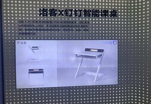 在进入展厅后,洛客公司的工作人员向同学们介绍了他们的新的设计成果。整个展厅里的展品和布局都极具吸引力,有与钉钉合作研发的有可直接通过WiFi将教学所需资料进行即时分发等功能的智能课桌。